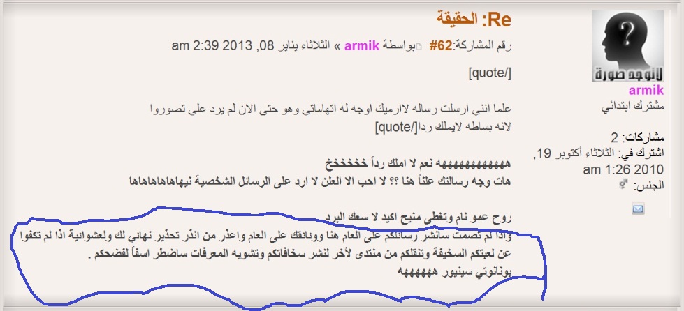 ولم يتوقف الامر عند هذا الحد فقط بل انه مارس الارهاب والتهديد ضد عضو يمني يدعى سرجون بحيث اختفى هذا العضو نهائيا من الانترنيت كما ترون هنا